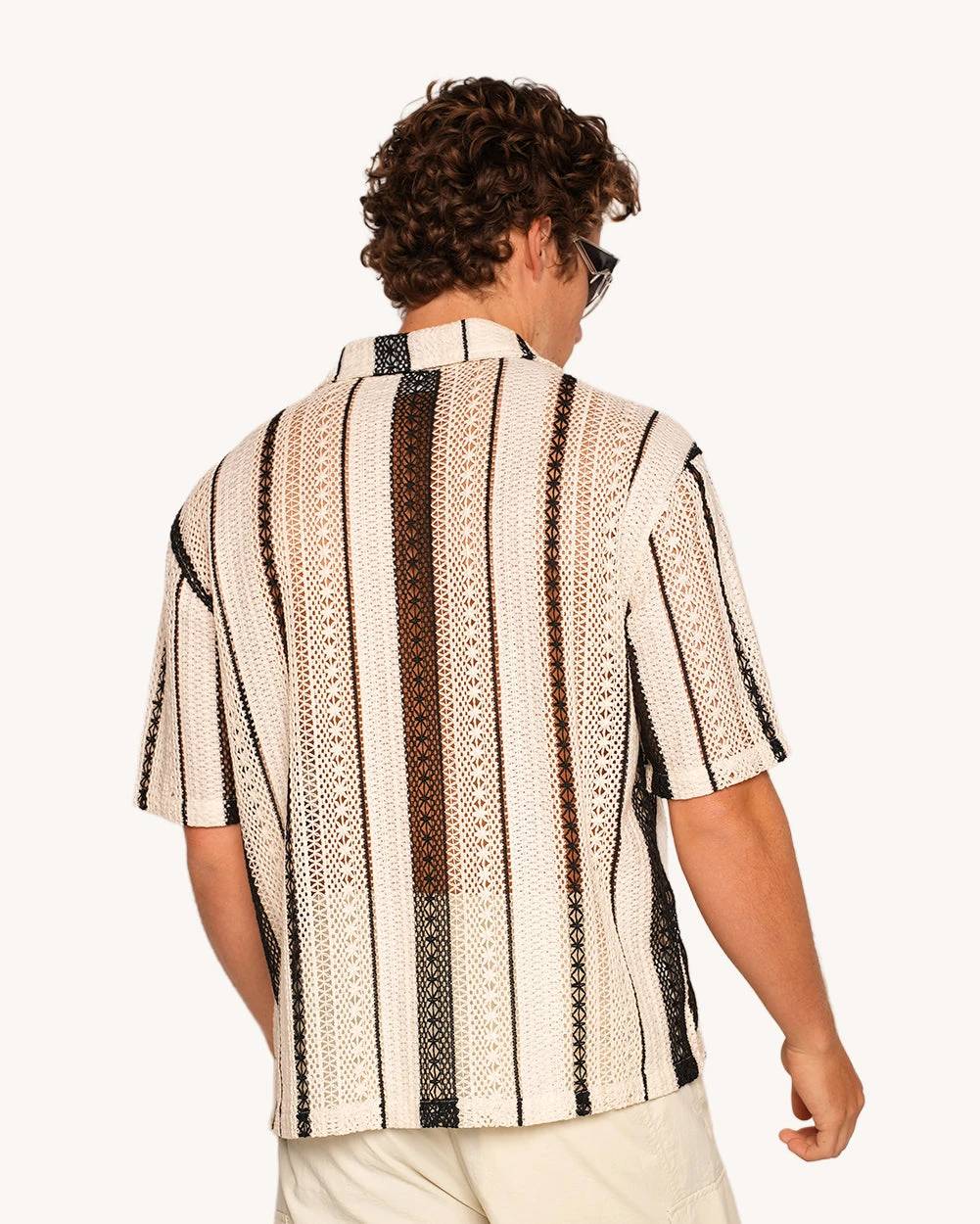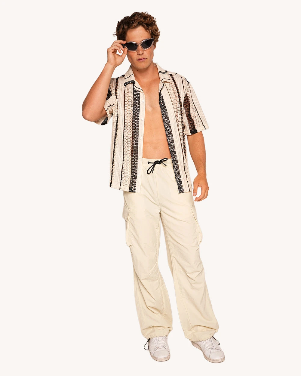 Channel ancient rhythms in the Bass Tribe Short Sleeve Button Up! It’s textured and open-weaved built for headbanging under dino bones and desert skies. With raw black-and-cream stripes and woven tribal detailing, this men’s rave top gives prehistoric energy with a modern edge.