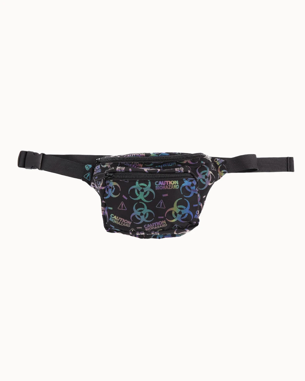 Add an electrifying touch to your festival or rave outfit with the Biohazard Reflective Fanny Pack! It features two spacious compartments perfect for all your rave essentials and an attention-grabbing rainbow reflective print.