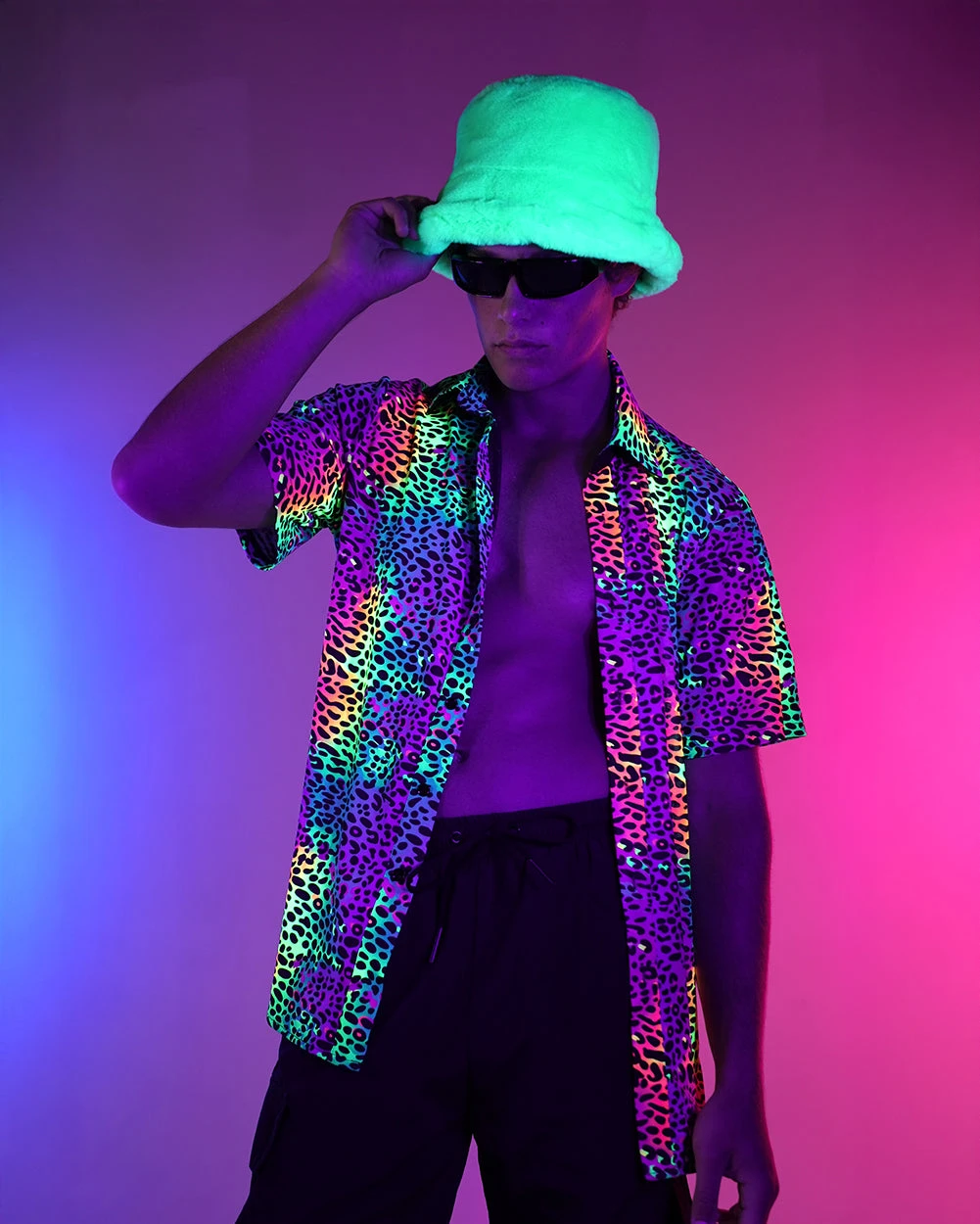 This shirt didn’t come to play; it came to glow. The Cosmic Jungle Camp Shirt is a relaxed-fit button-up made with UV-reactive rainbow leopard print that lights up under blacklight. Wear it open, closed, or halfway unbuttoned for ~maximum mischief~.