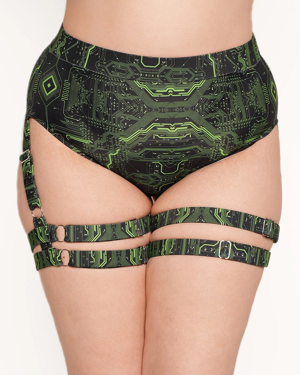 Morph into supremacy with the Cyber Matrix Harness Booty Shorts! This triangle top is edgy, sexy, and features a striking geometric print in high-voltage black with neon green details. Â