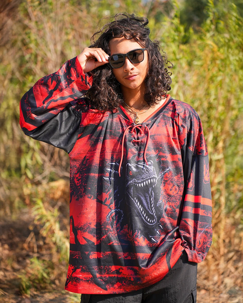The Earthshaker Jersey is not for the faint of heart. With a blood-red lava print, front-and-center roaring dino graphic, and varsity-inspired lace-up neckline, this unisex top screams prehistoric power.Â