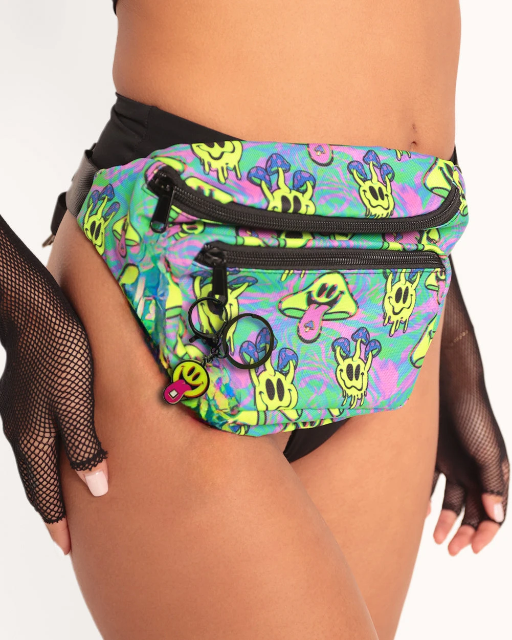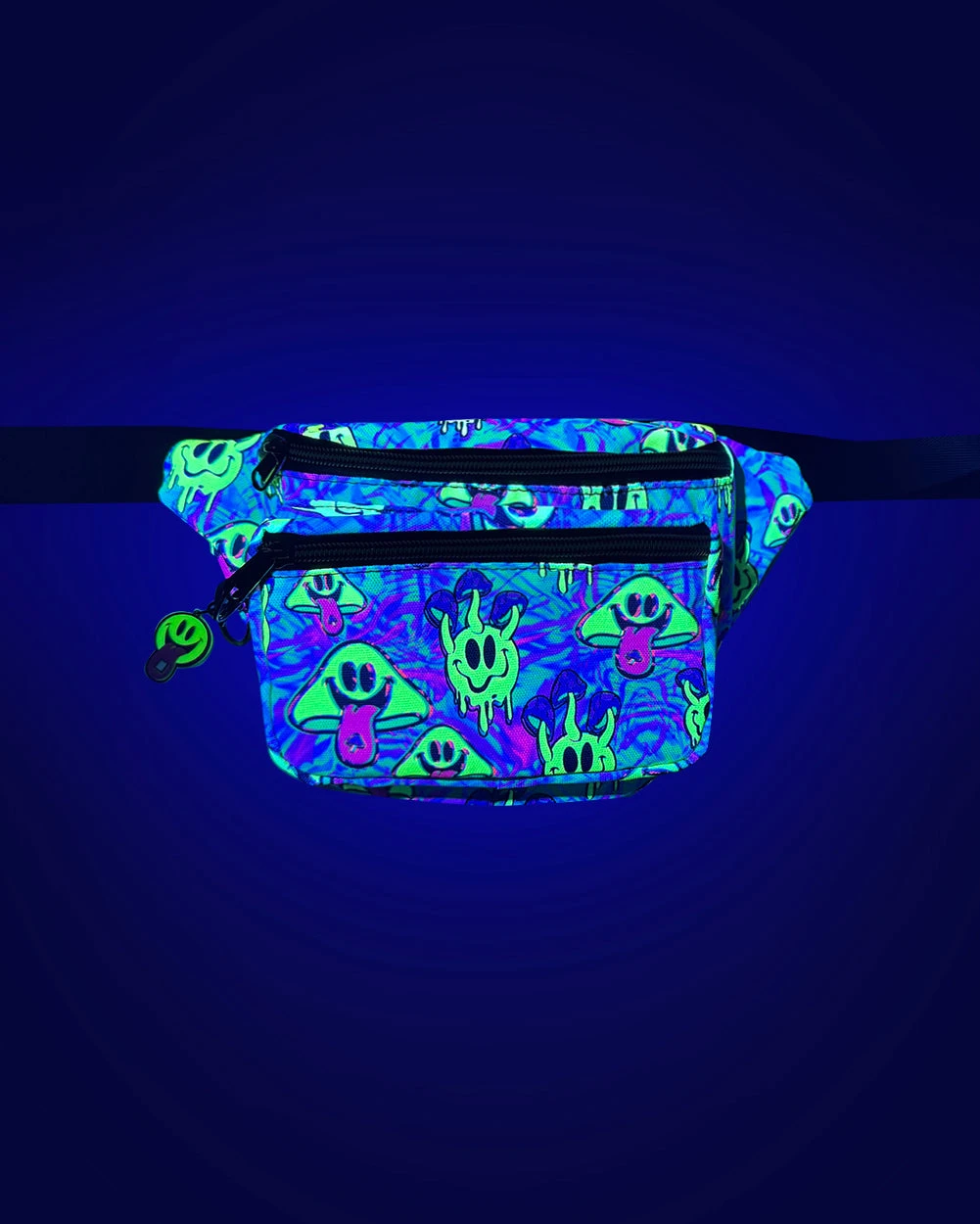 Turn your vibe up to 100 with the Electric Tripp UV Reactive Fanny Pack! Bubblegum blue, trippy patterns, and bold smileys everywhere—this bum bag is a full-on psychedelic experience that’ll have you rocking the rave in technicolor style.