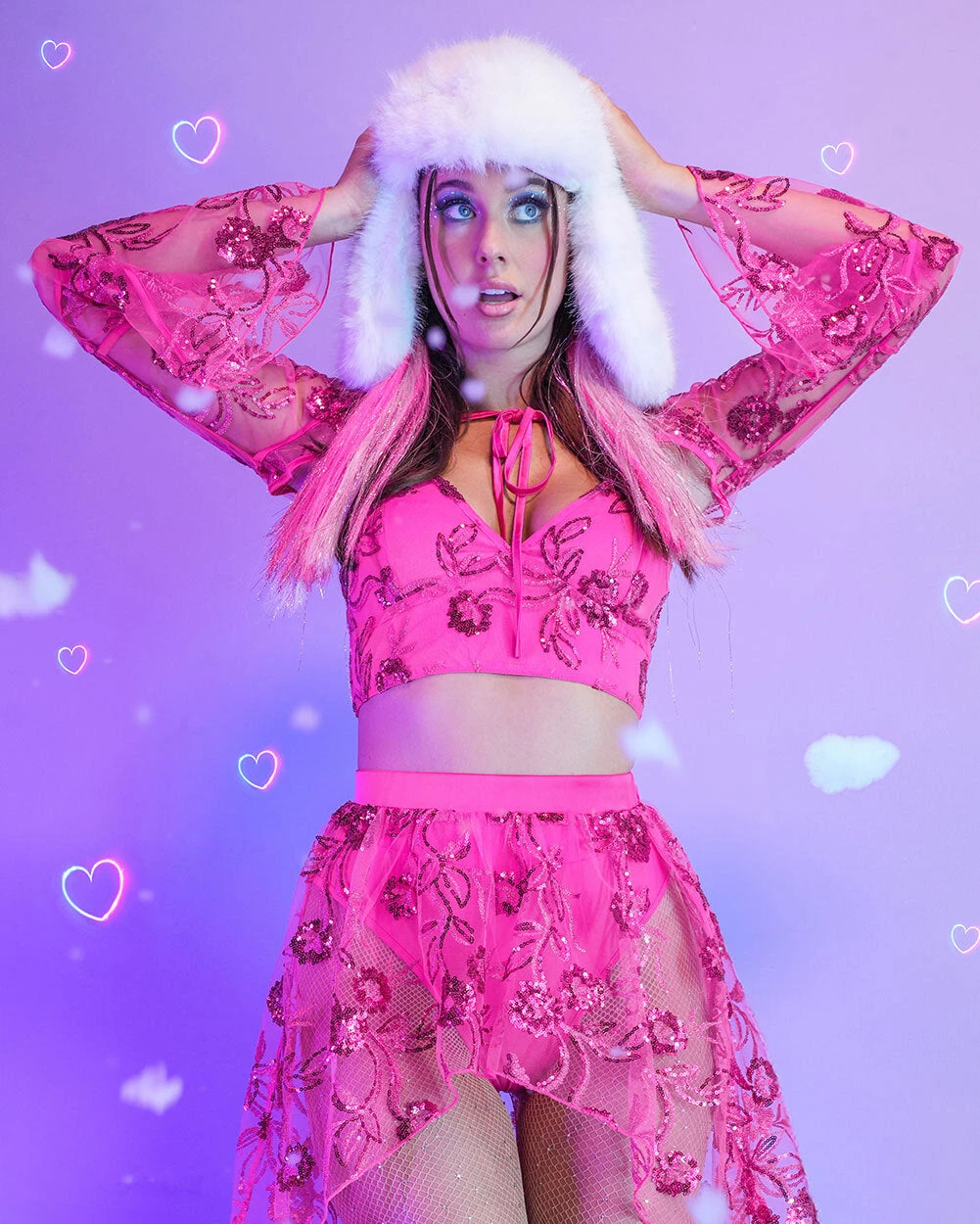 Welcome a world of sparkle and enchantment with the Glimmer in the Garden Tie-Front Ultra Crop Top! This radiant top features vibrant pink mesh, twinkling sequin florals, and flowy bell sleeves that bring a touch of magic to your look.