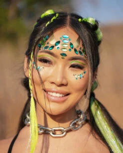 Summon ancient sea magic with the Goddess of the Deep Face Gems! With shimmering blues, greens, and gold horn accents, this look is part ethereal royalty, part mythical beast.