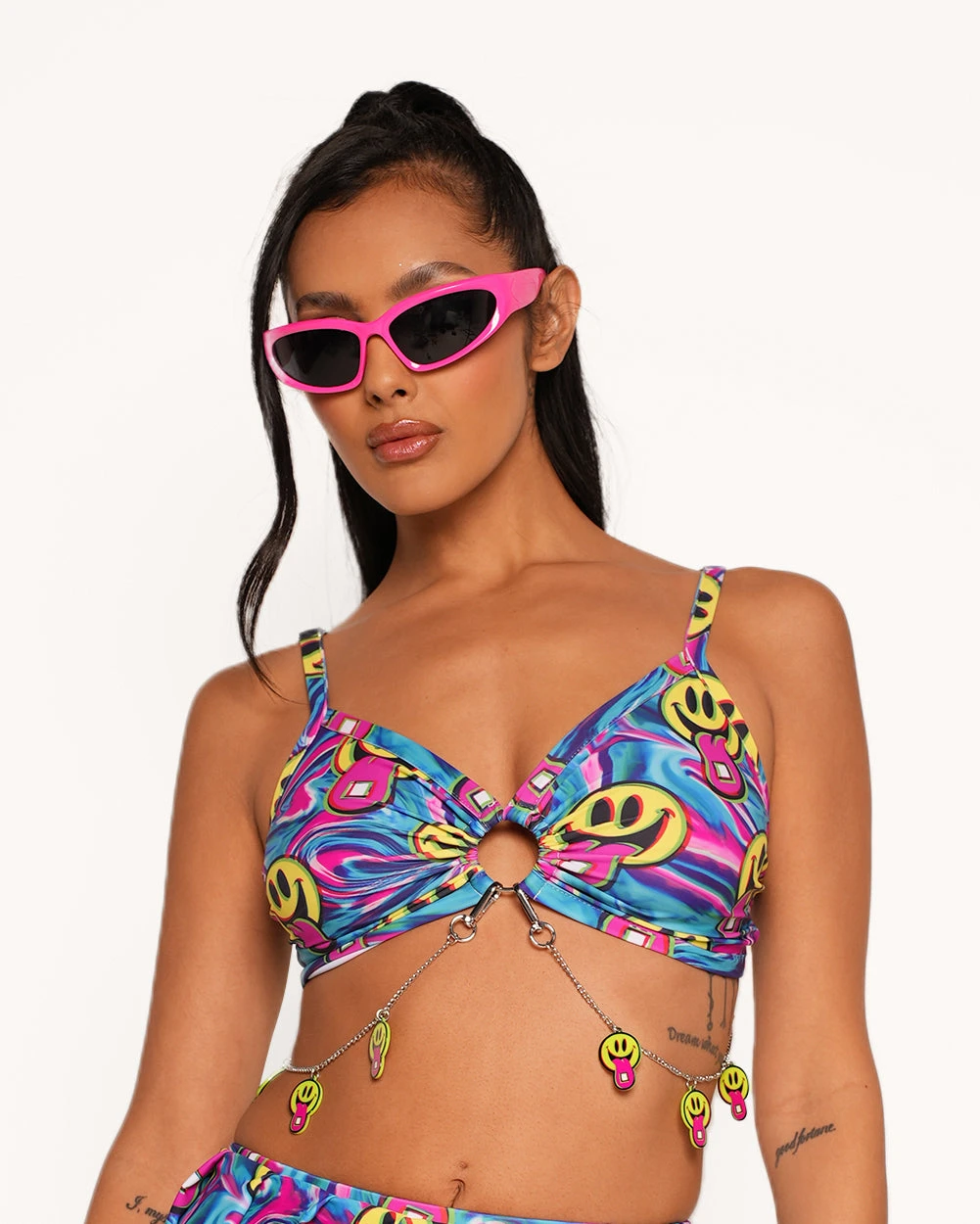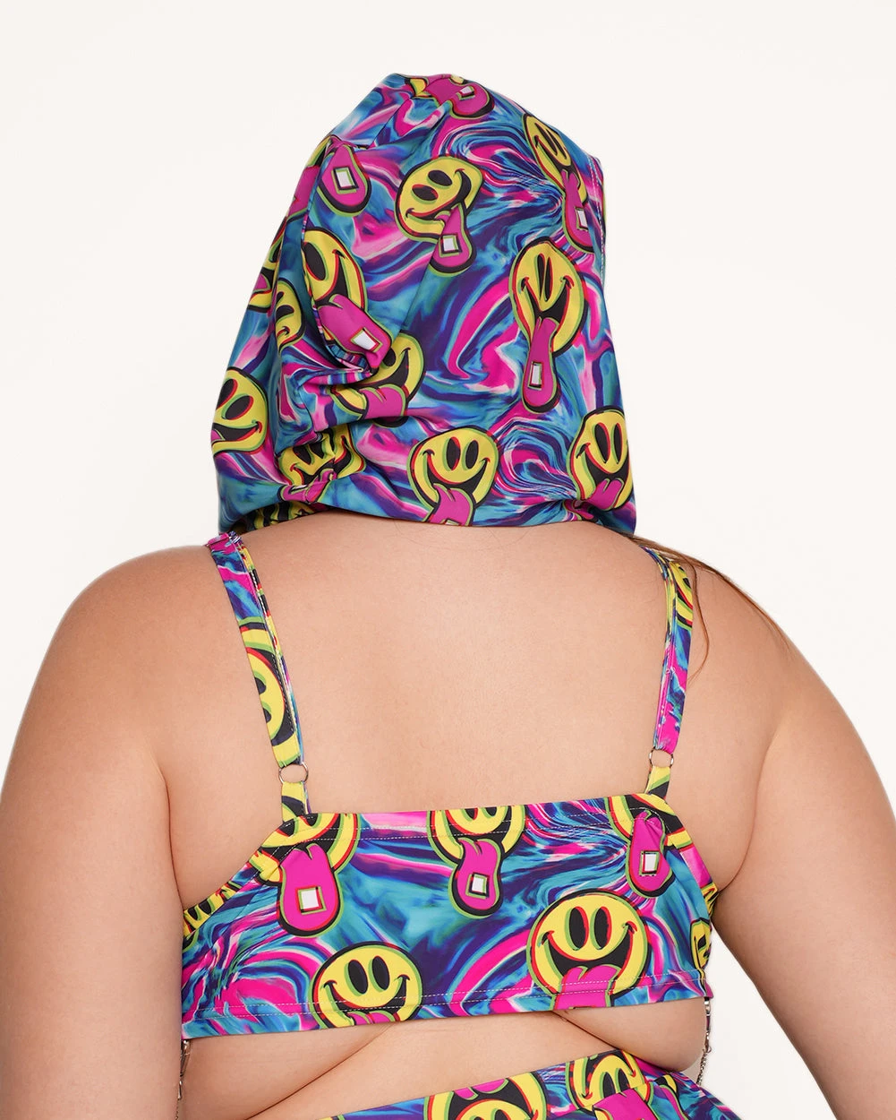 Put on the Happy Hour Hood and instantly feel the night come alive! With our iconic acid smileys all over this bra top, you’re sure to steal the scene and immerse yourself in pure bliss.