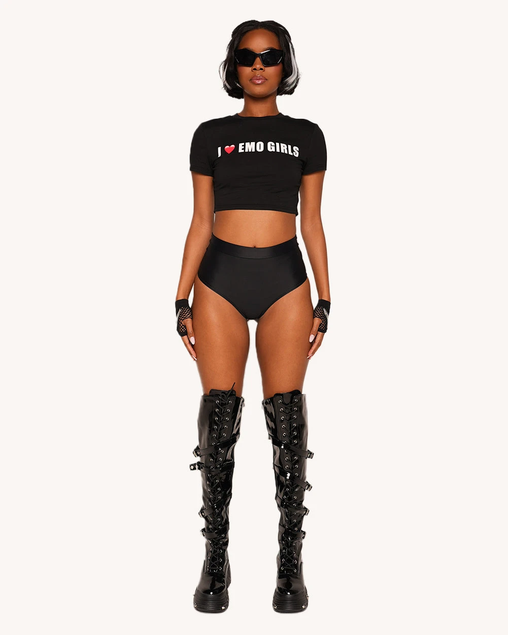 Cuz sad girls do it better! Pair the I Love Emo Girls Crop Top with ripped fishnets, smudged eyeliner, cheeky bottoms, and sky high platforms. You know the vibe.
