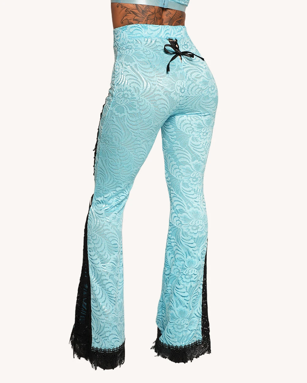 The Jami Jones x iHR Lace Me Up Pants do not come to play! Made with stretchy lace and cutout lace-up thigh panels that demand attention, this flared fit is all drama, all night.