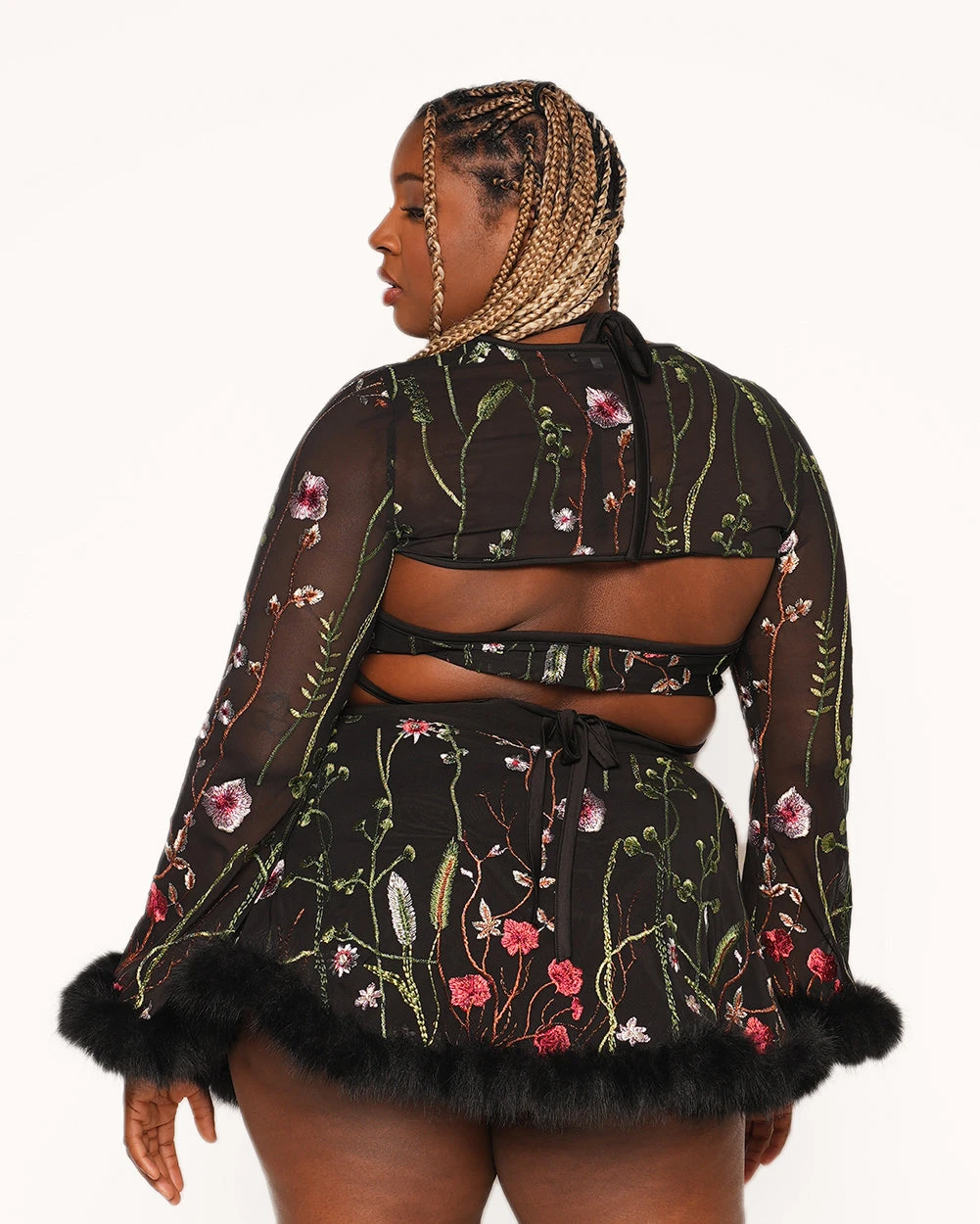 Twirl through desert fields with the Lace Flowerfields Stretch Marabou Ultra Crop Top 2.0! This ethereal dream features delicate floral lace and a flowing bell sleeve design with marabou trim. Pair it with its matching top and skirt for a goddess-worthy look that blooms with every step.