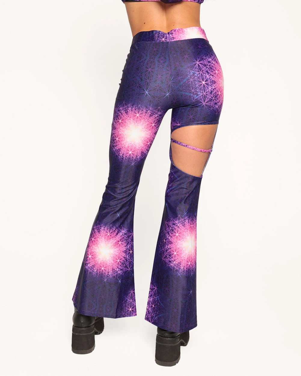 Unlock the cosmos with the Quantum Synergy Bell Bottoms! Featuring a figure-flattering fit, a unique cutout design, and a mind-bending print that’s both euphoric and electrifying.