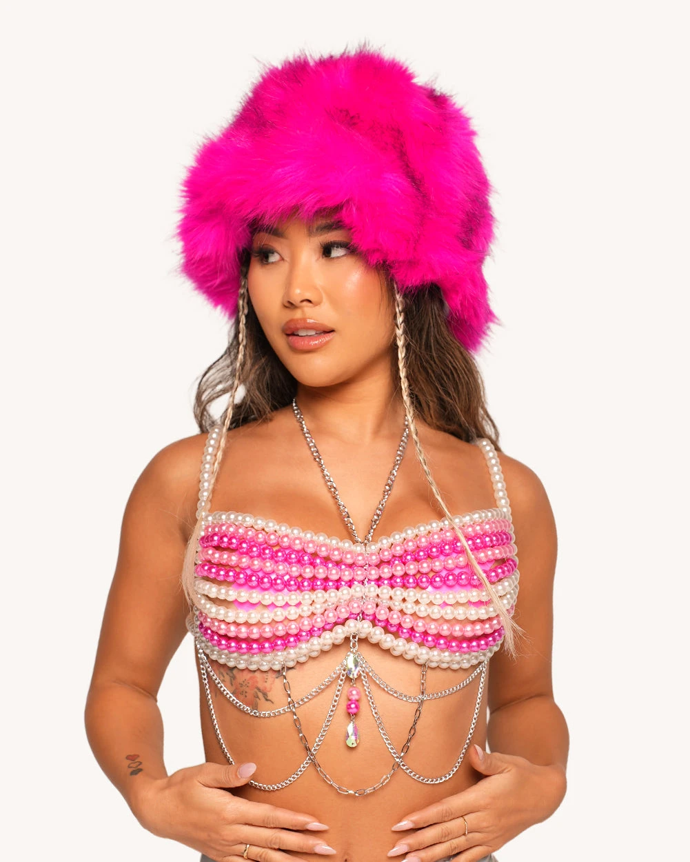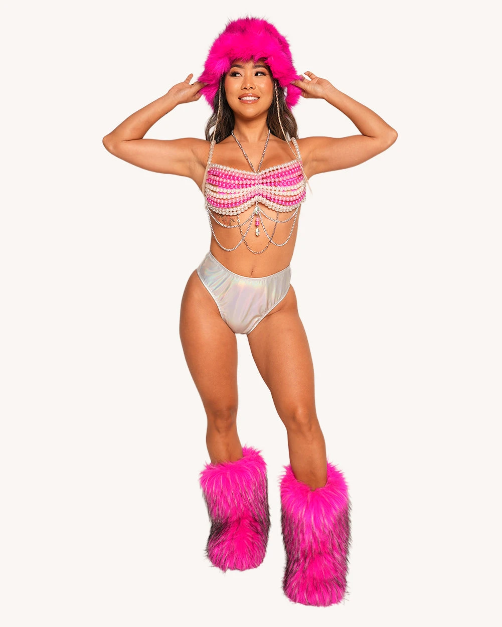 Serve full siren fantasy in the Seashell Sweetheart Pearl Chain Top! This ultra-dreamy bandeau top is dripped in rows of pink and pearl beads and cascading chains, giving major mermaid energy with every shimmer.