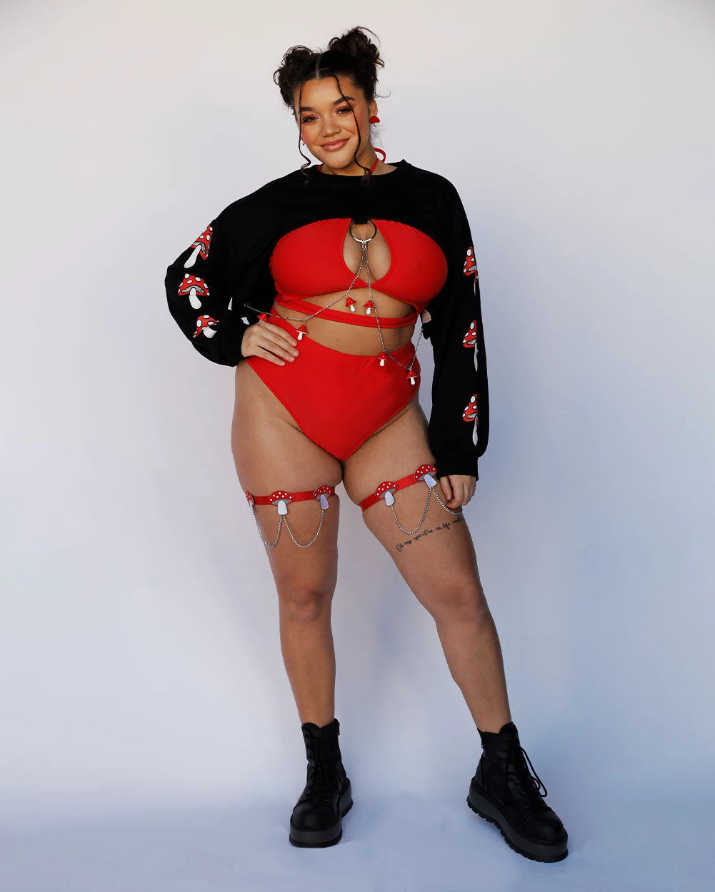 Keep the trippy vibes going with the Shroomy Chain Leg Garters! Wear this with a daring skirt, shorts, or a whimsical festival outfit to elevate your style game.