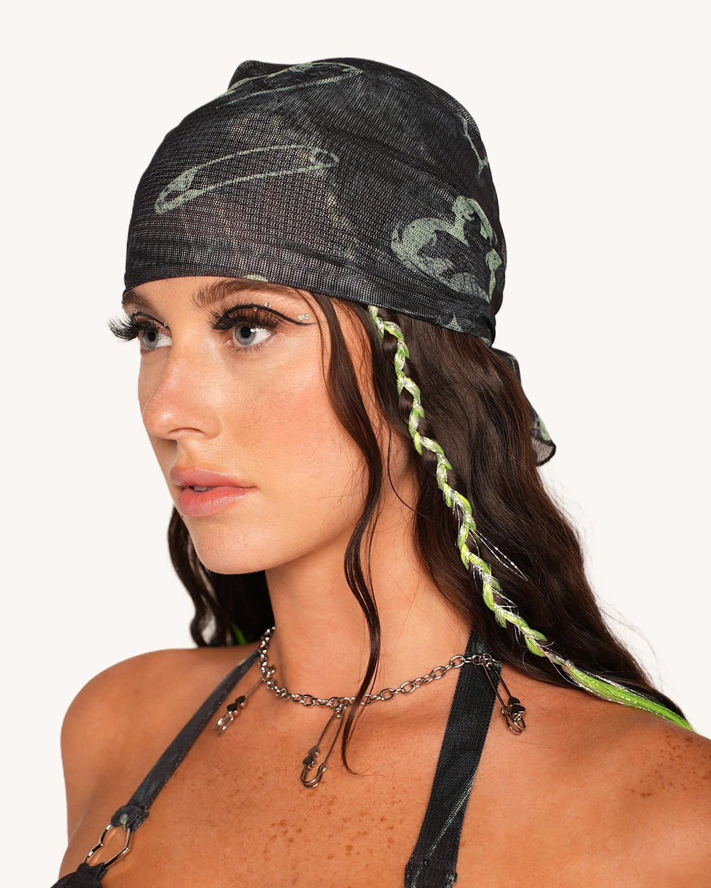 The Sunflowerraver x iHR Get Bent Bandana is for the girls who feel everything a little too much and look hot doing it! Decked out in heartbreaks and punky safety pins, this accessory is chaotic and dramatic in the best way possible.Â
