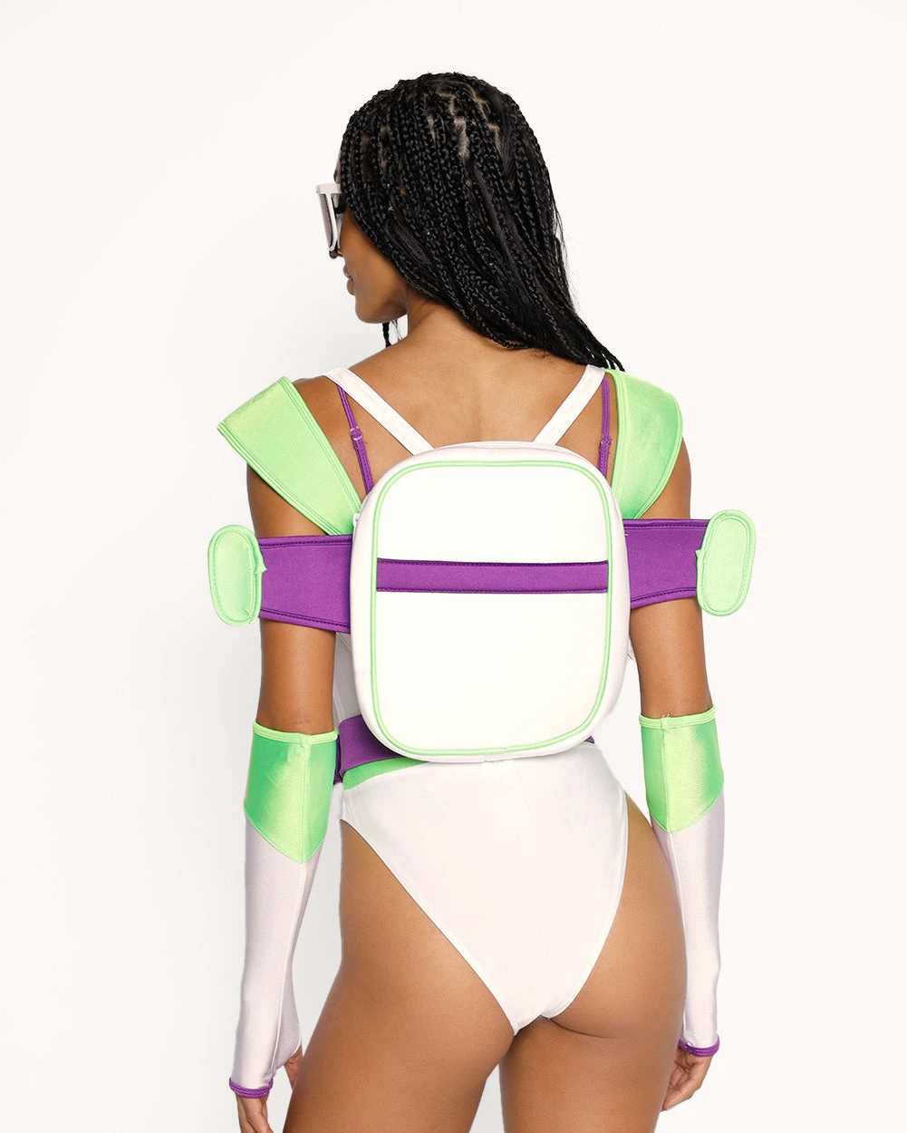 - Includes: Bodysuit, Backpack, Sunglasses, Arm sleeves