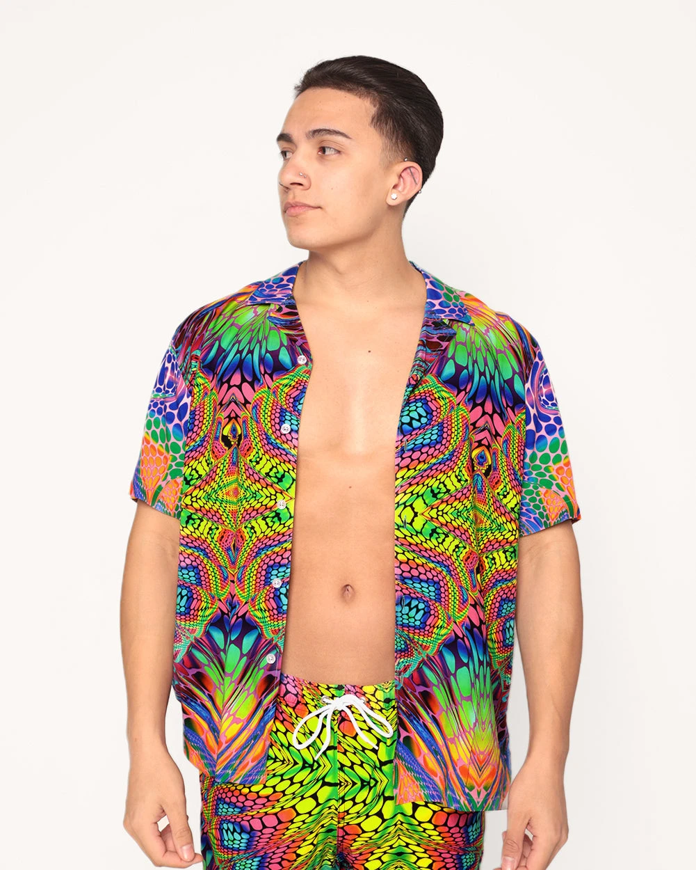 Slither into the spotlight with the Viper Vision Camp Shirt! This trippy masterpiece is designed to captivate and mesmerize, with its relaxed fit and enchanting viper print.