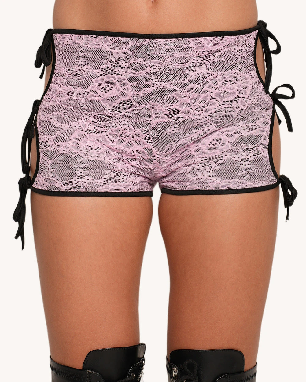 Turn up the volume with the White Noise Booty Shorts! Featuring a sweet lace construction with bold cutouts, black contrast trim, and tie-up details made for dancing under the sun.