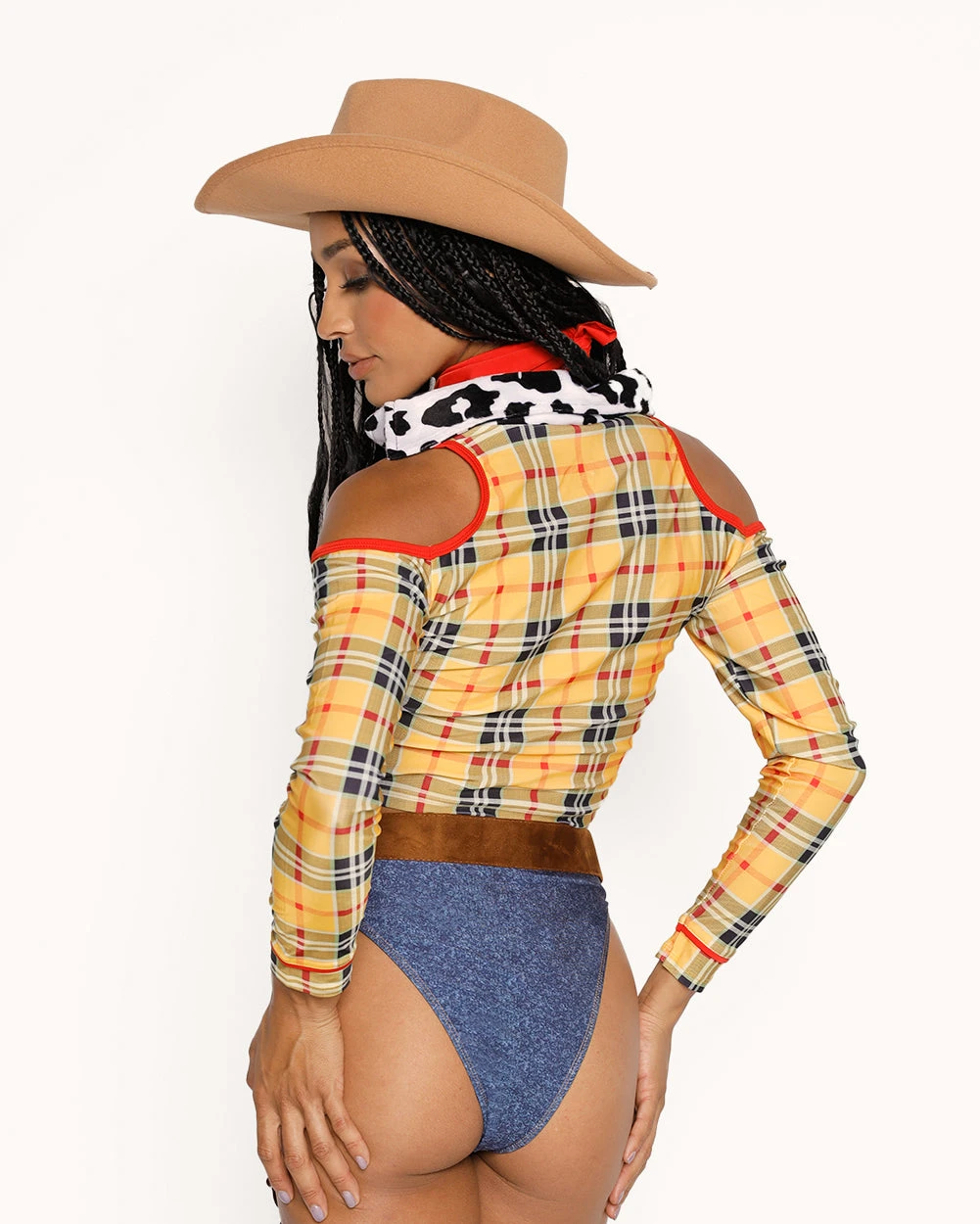 On the hunt for adult Halloween costumes with your rave bae? Make a killer entrance to ur upcoming party with the Woody Cowgirl Costume Set! It comes with a plaid long-sleeve crop top, bandana, and bottoms that feature a sexy leg harness.